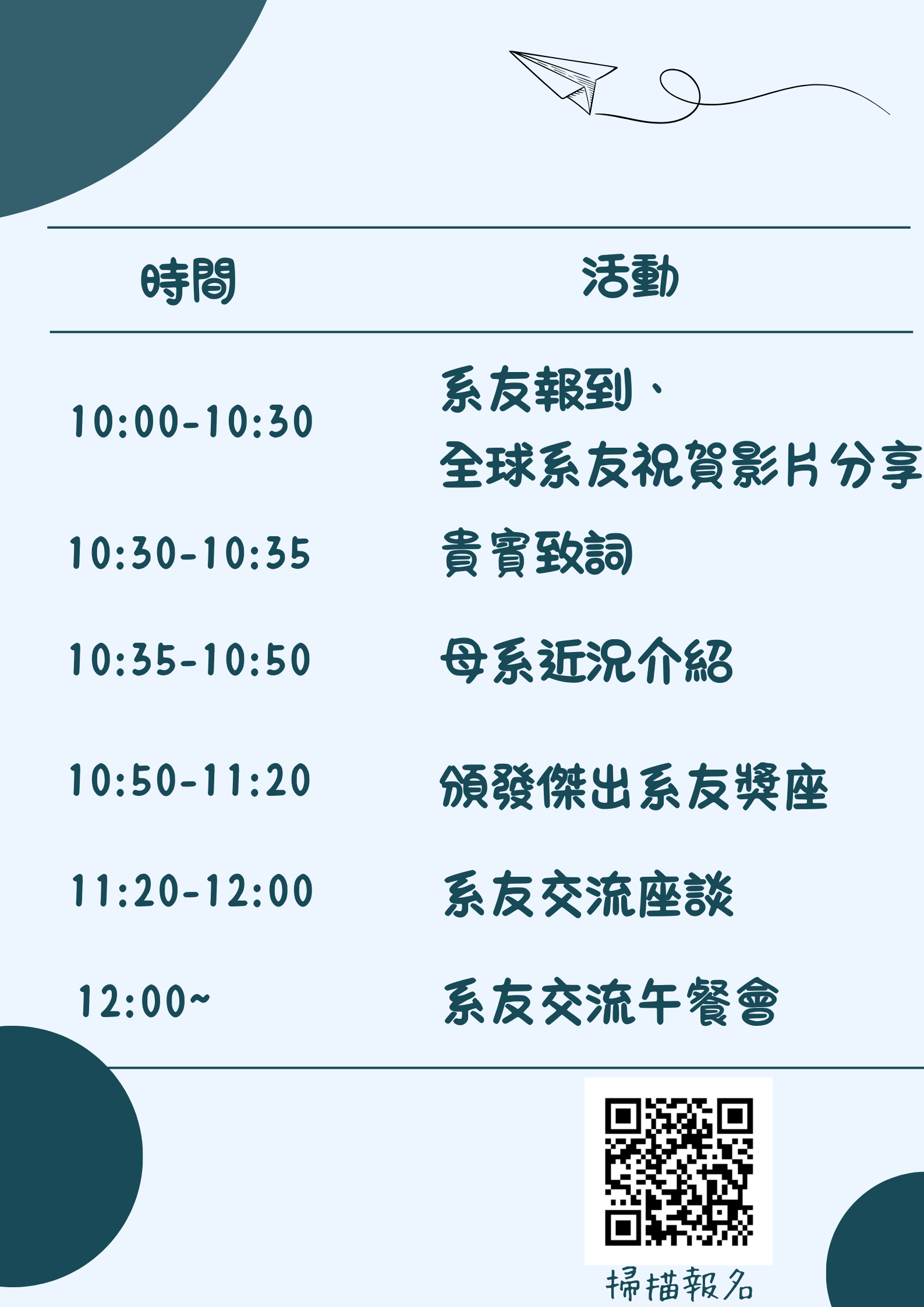 再一次誠摯地邀請您一同來共襄盛舉!有意回母系的系友們敬請填寫報名表回傳,也感謝畢業系友們撥空閱讀此信。