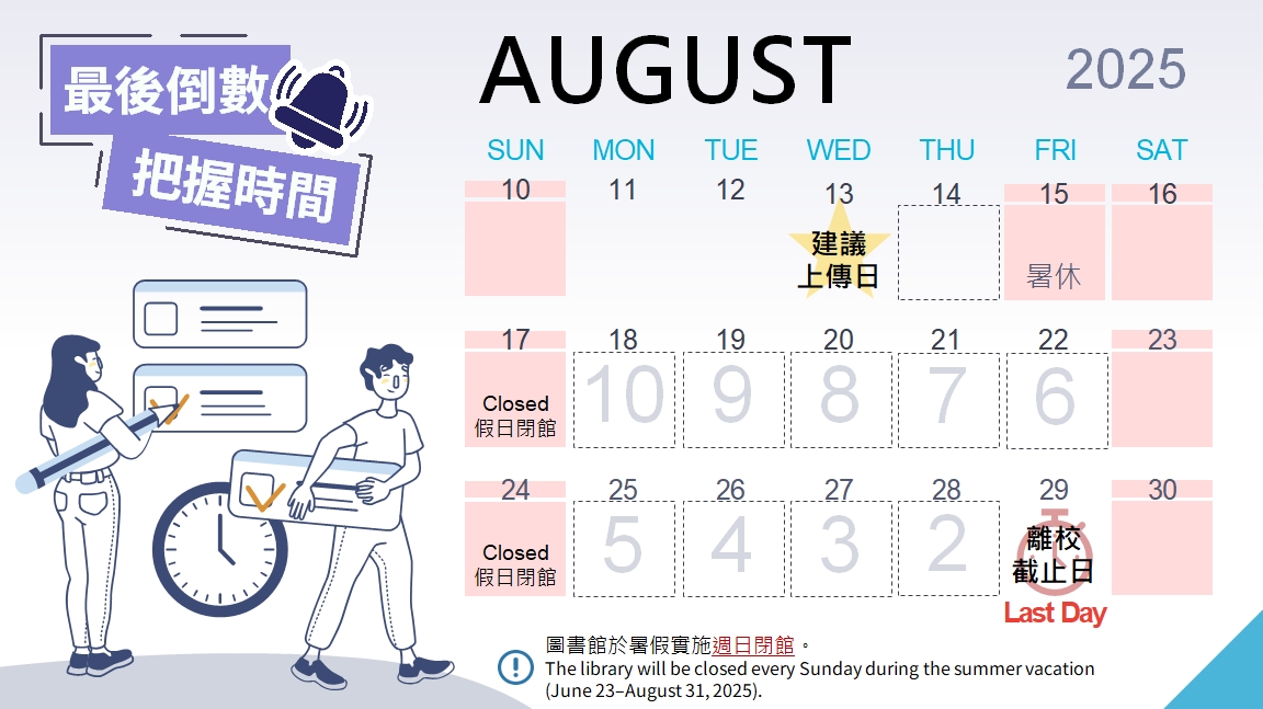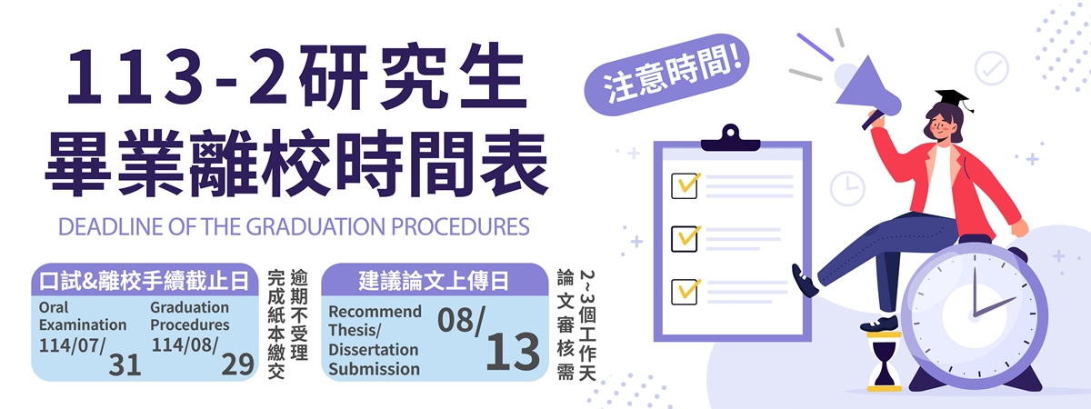 建議研究生儘早在114/8/13(三)前上傳論文,以順利完成紙本論文繳交及畢業離校手續。