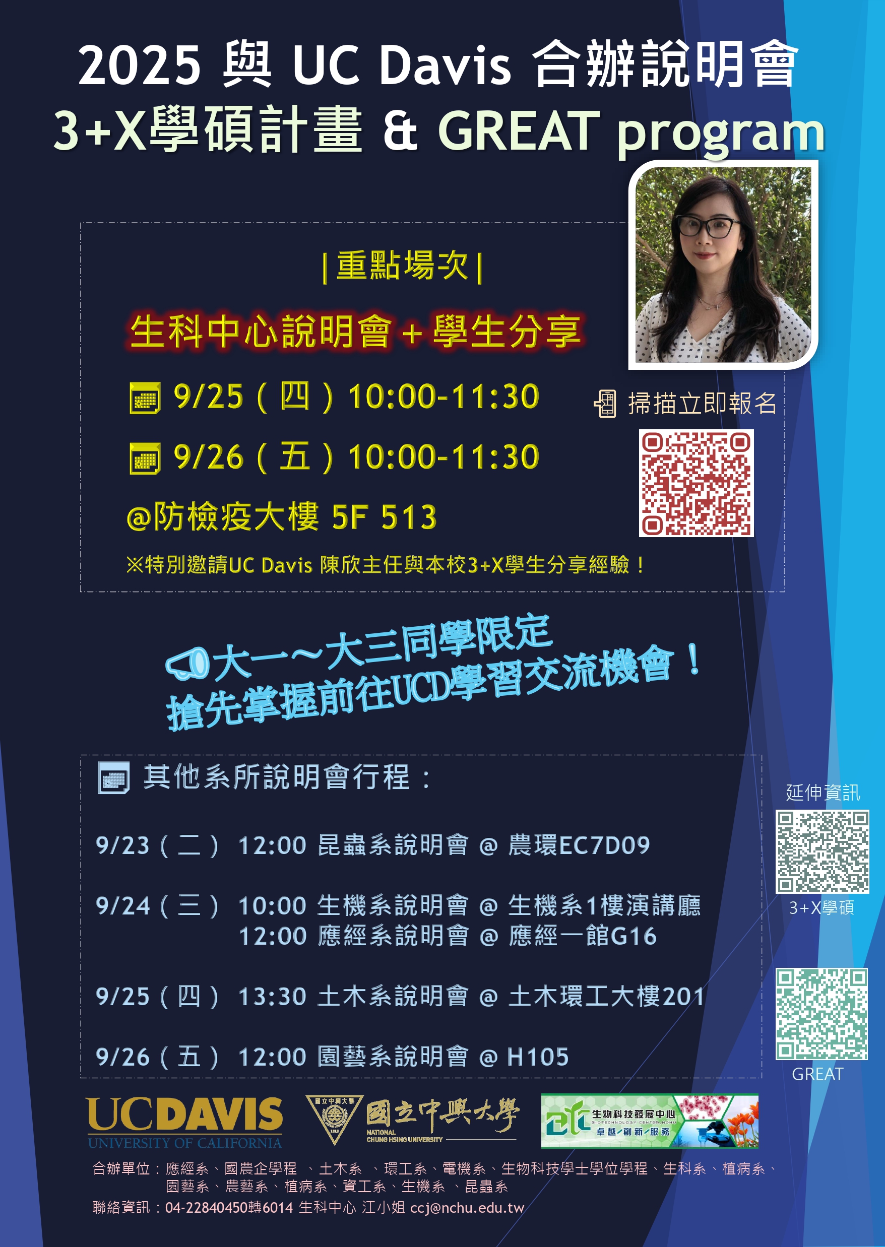 將舉辦兩場生科中心說明會暨學生分享會,特別邀請 UC Davis 承辦人 陳欣主任 與本校 3+X 學生進行經驗分享。