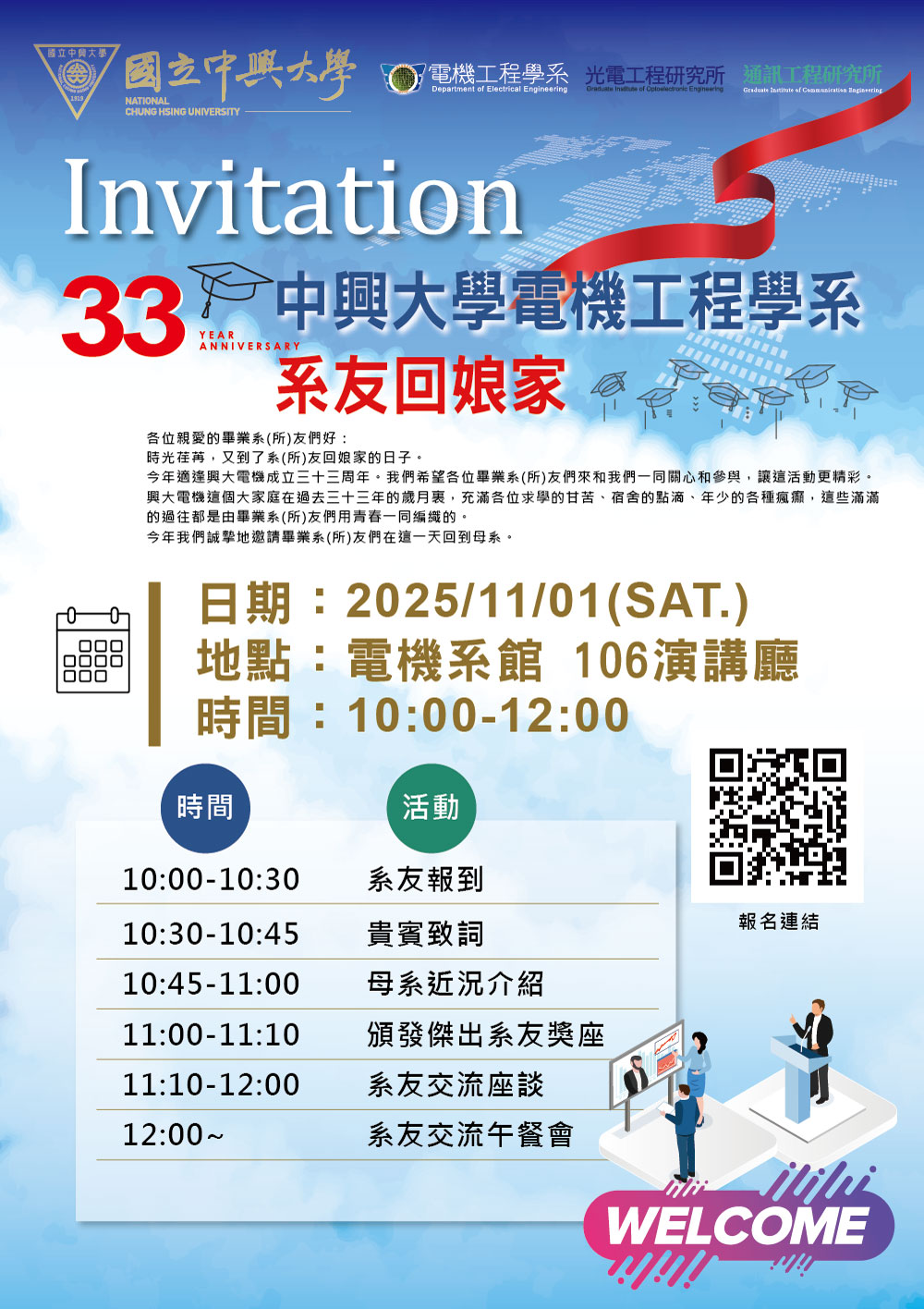 今年適逢興大電機成立三十三周年。我們希望各位畢業系(所)友們來和我們一同關心和參與,讓這活動更精彩。